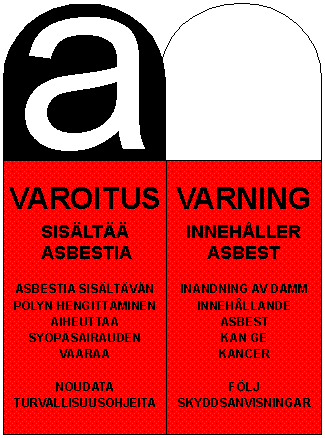 -alaosaan (h 2 = 60 % H) kuuluu selvästi luettavissa oleva, valkoinen tai musta vakioteksti 'VAROITUS SISÄLTÄÄ ASBESTIA Asbestia sisältävän pölyn hengittäminen aiheuttaa syöpäsairauden vaaraa Noudata turvallisuusohjeita'. Tekstin tulee olla punaisella pohjalla.